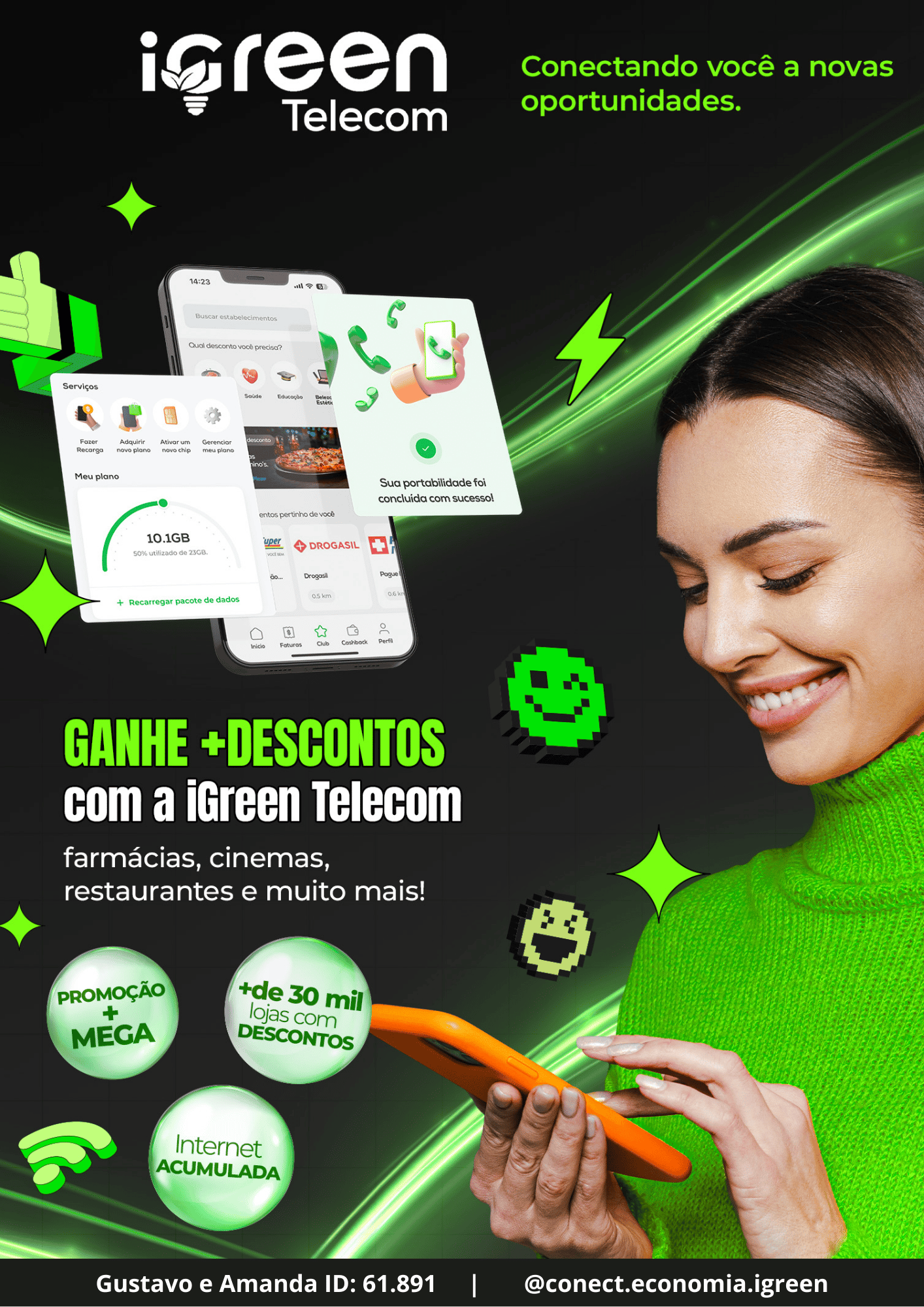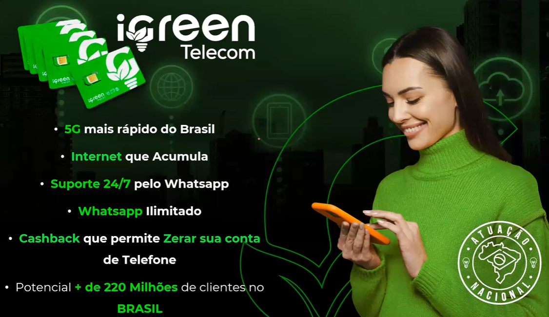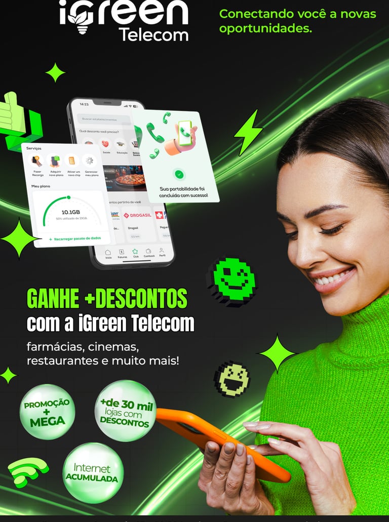 A iGreen Telecom é a solução em telefonia móvel da iGreen Energy. Com a Telecom você desfruta de planos incríveis de internet cumulativas, e ainda ganha acesso ao iGreen Club, ganhando descontos em mais de 600 mil produtos e serviços em todo o Brasil!